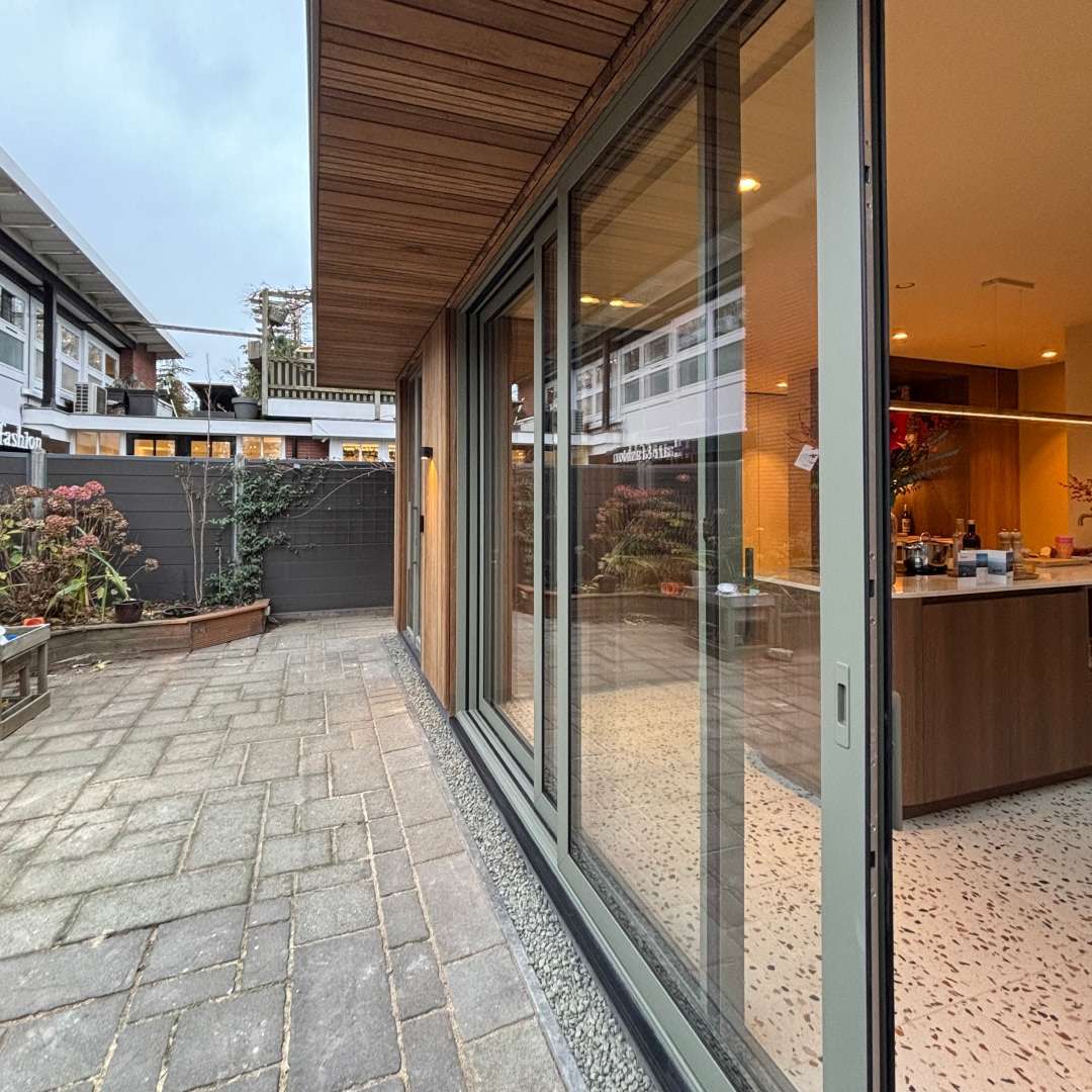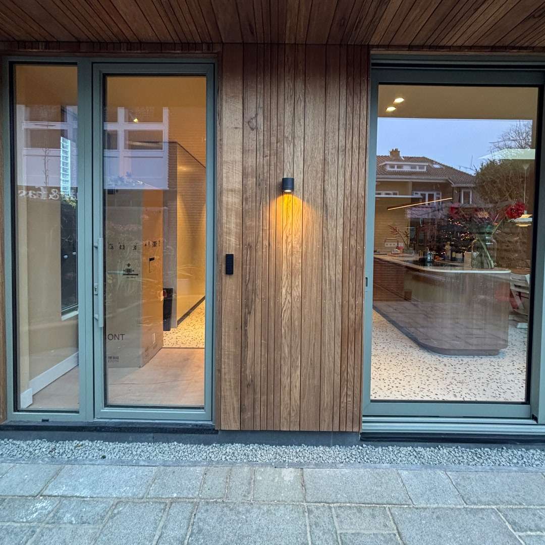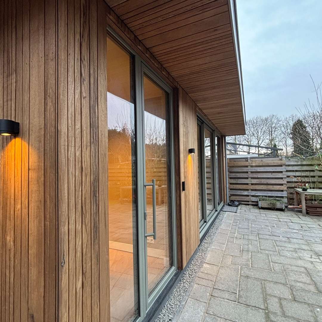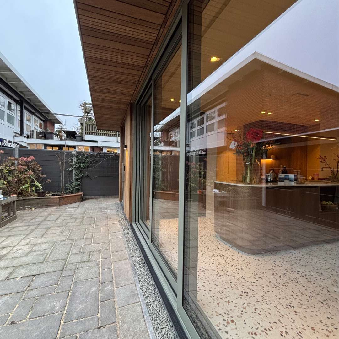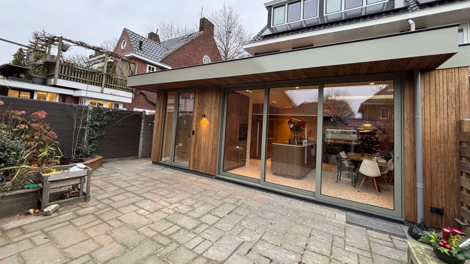 Voor deze klant hebben wij een keukenuitbouw gerealiseerd, voorzien van grote schuifdeuren en een daklicht dat naadloos aansluit op de achterwand. De uitbouw is opgebouwd met hoogwaardige isolatieplaten met een hoge RD-waarde en aangesloten op water en elektra. De vloer is verdiept en geïsoleerd, waarna wij vloerverwarming hebben aangelegd en de vloer hebben geëgaliseerd. Vervolgens is deze afgewerkt met door de klant geselecteerde tegels. Aan de buitenzijde hebben wij al het timmerwerk uitgevoerd en het dak voorzien van nieuwe dakbedekking.