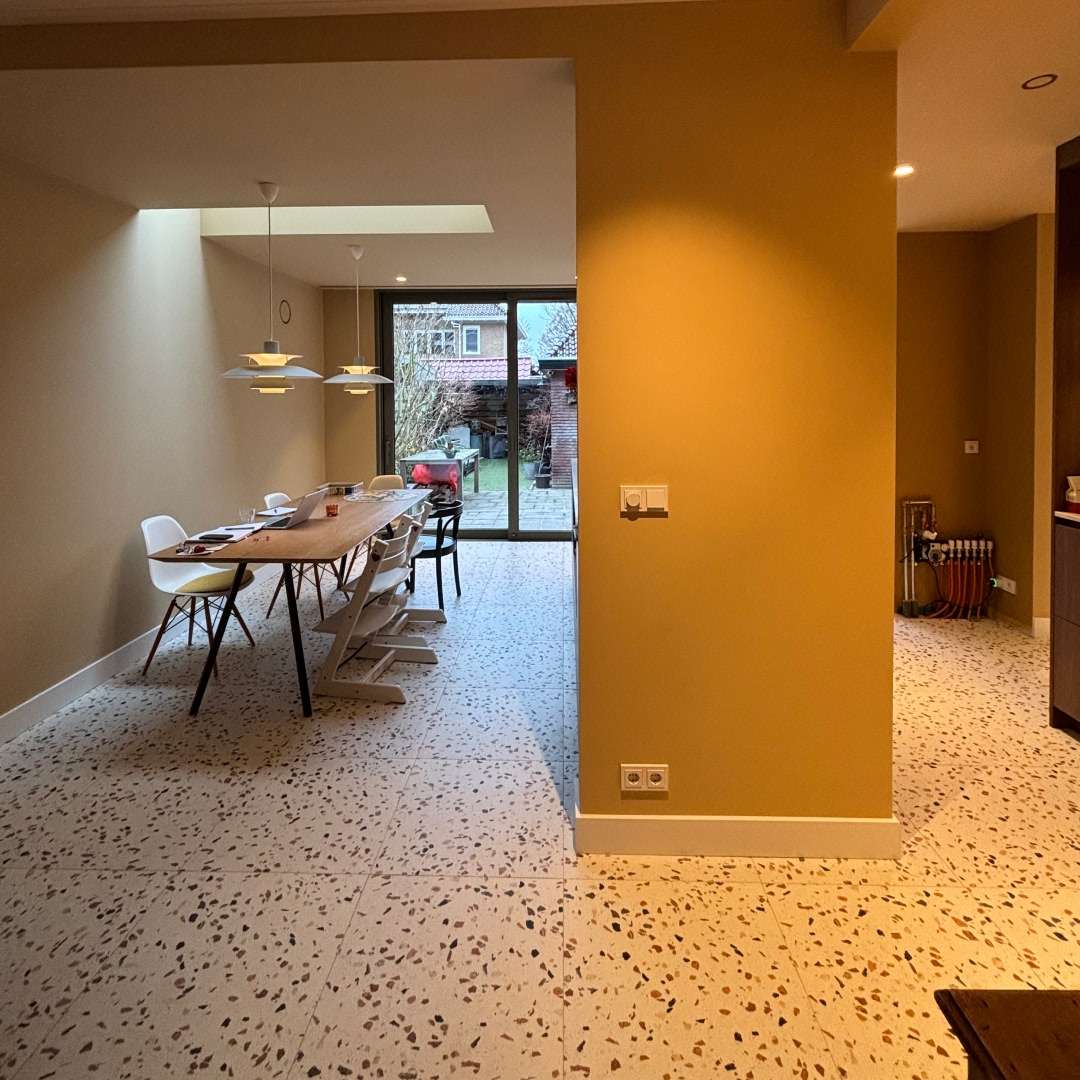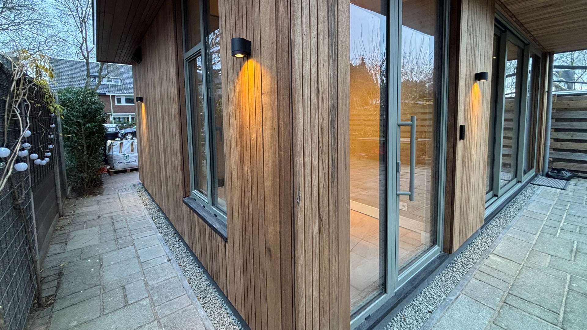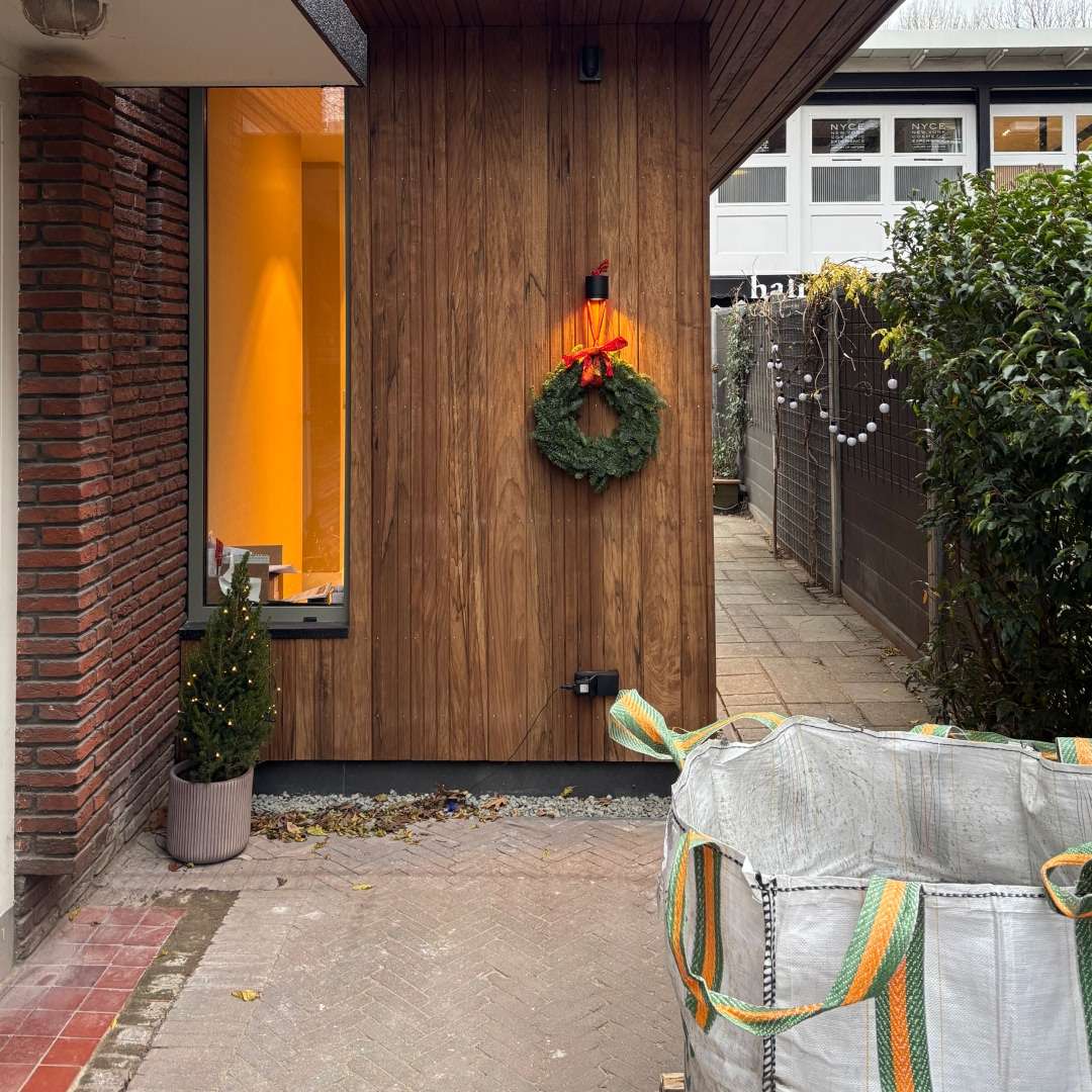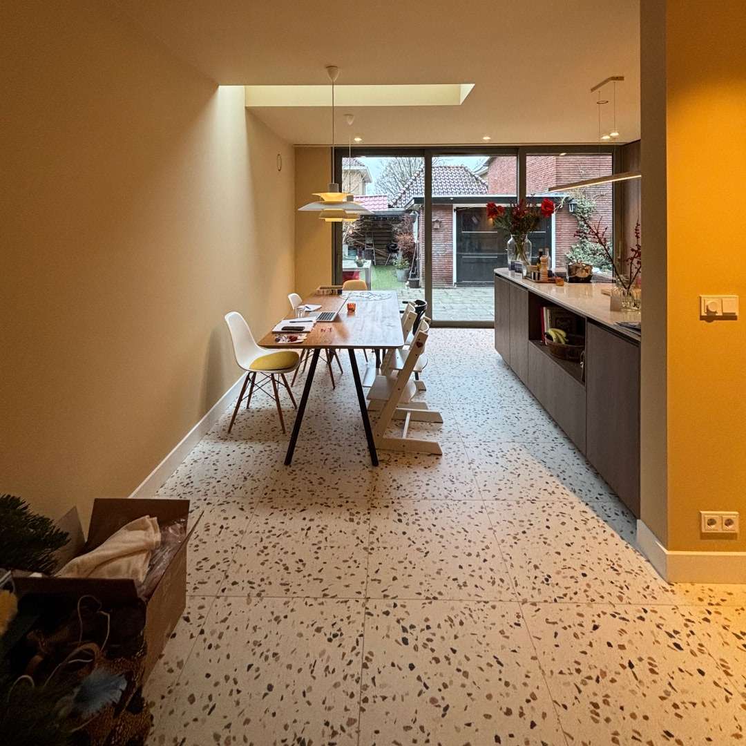 Voor deze klant hebben wij een keukenuitbouw gerealiseerd, voorzien van grote schuifdeuren en een daklicht dat naadloos aansluit op de achterwand. De uitbouw is opgebouwd met hoogwaardige isolatieplaten met een hoge RD-waarde en aangesloten op water en elektra. De vloer is verdiept en geïsoleerd, waarna wij vloerverwarming hebben aangelegd en de vloer hebben geëgaliseerd. Vervolgens is deze afgewerkt met door de klant geselecteerde tegels. Aan de buitenzijde hebben wij al het timmerwerk uitgevoerd en het dak voorzien van nieuwe dakbedekking.