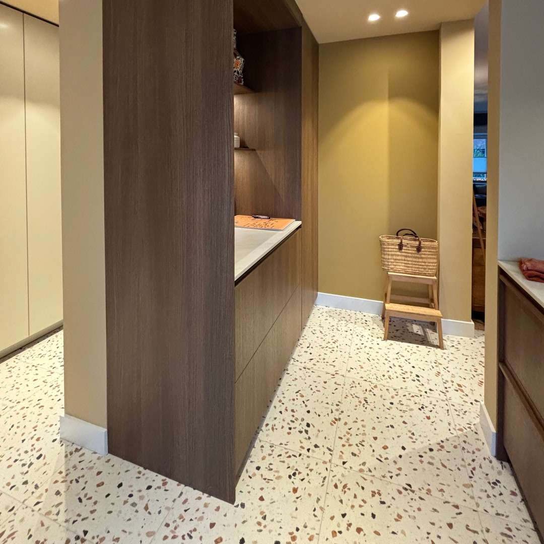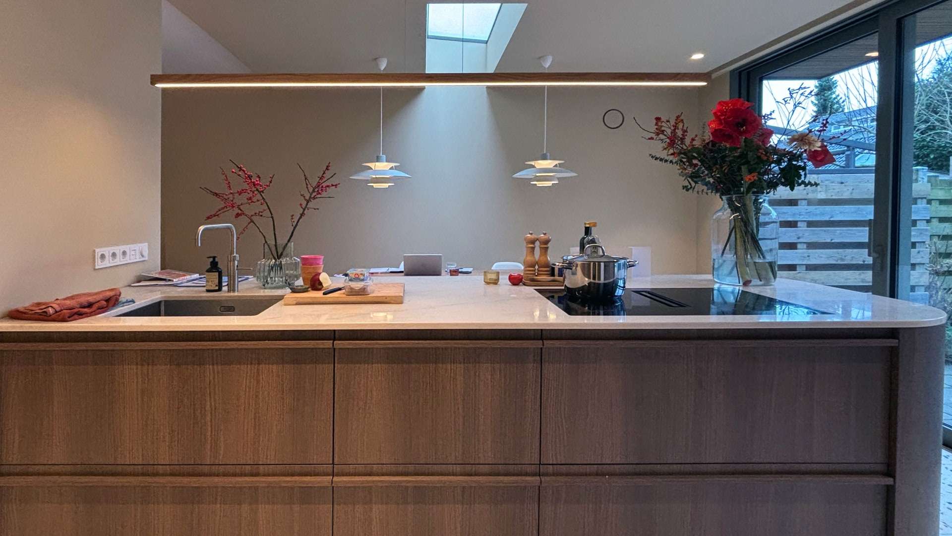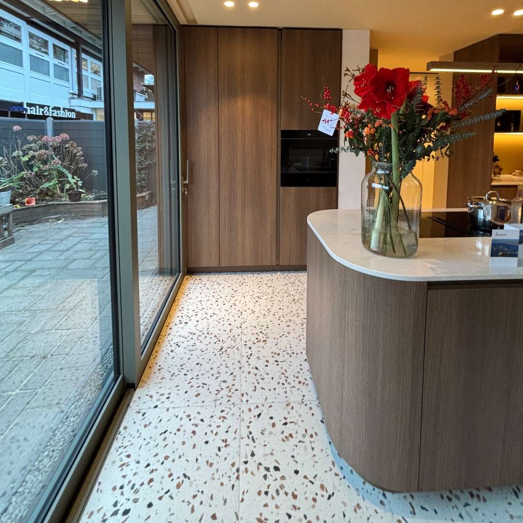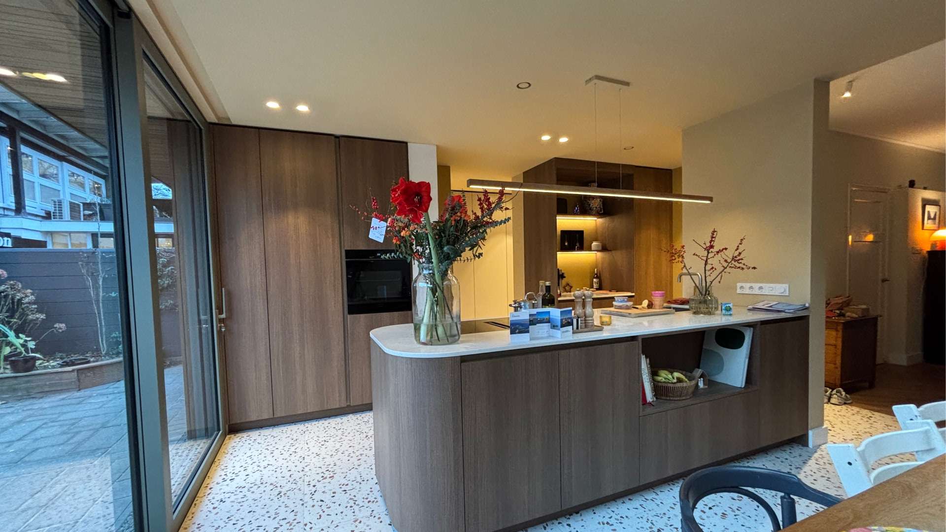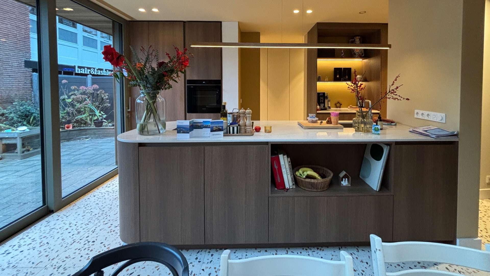 Voor deze klant hebben wij een keukenuitbouw gerealiseerd, voorzien van grote schuifdeuren en een daklicht dat naadloos aansluit op de achterwand. De uitbouw is opgebouwd met hoogwaardige isolatieplaten met een hoge RD-waarde en aangesloten op water en elektra. De vloer is verdiept en geïsoleerd, waarna wij vloerverwarming hebben aangelegd en de vloer hebben geëgaliseerd. Vervolgens is deze afgewerkt met door de klant geselecteerde tegels. Aan de buitenzijde hebben wij al het timmerwerk uitgevoerd en het dak voorzien van nieuwe dakbedekking.